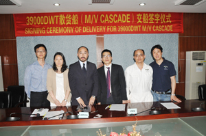 2014年5月28日上午,我司为首艘39000DWT散货船JNS134船举行的交船签字仪式在公司五楼总经理会议室进行,公司码头项目组经理冯抓纲和嘉吉船东代表PETER LEE在仪式上签字,船东现场监造组和公司市场部人员出席了交船签字仪式。