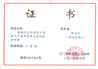 近日,我司申报的专利技术项目《船舶克令吊现场大型法兰平面测量器与磨削机的研制》荣获2013年度新会区科学技术二等奖,并获得奖金两万元。