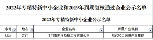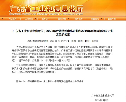 1月6日广东省工业与信息化厅发布了《关于2022年专精特新中小企业和2019年到期复核通过企业名单的公示》,我司成功入选“2022年广东省专精特新中小企业”。