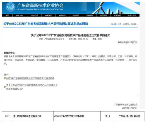 近日,广东省高新技术企业协会发布了《关于公布2023年广东省名优高新技术产品名单的通知》(粤高企协[2023]20号),我司自主研发的“40500DWT敞口型节能环保散货船”凭借卓越的创新能力和先进的技术水平,荣获2023年广东省名优高新技术产品称号。